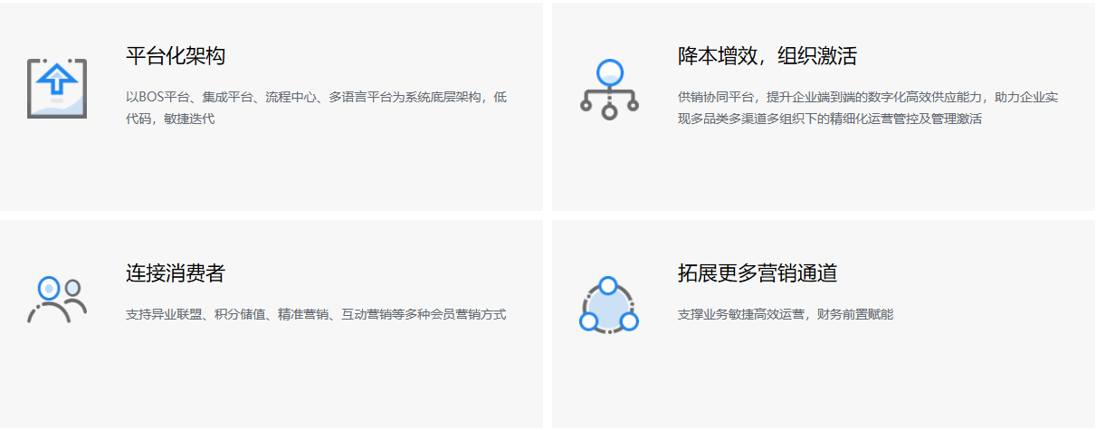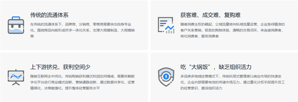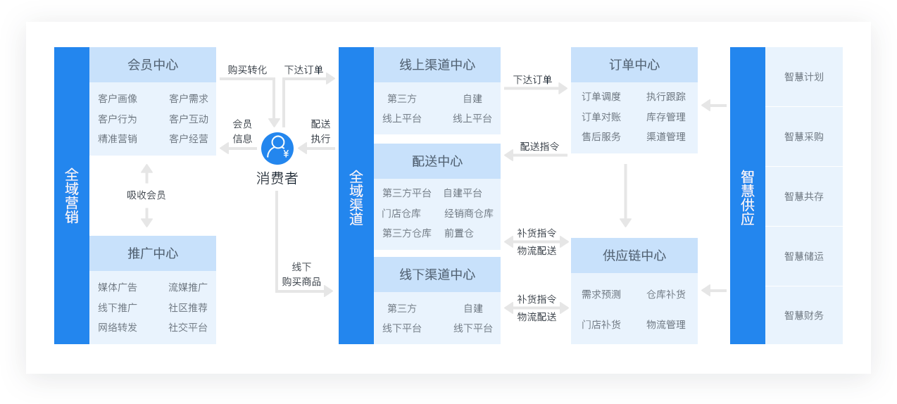 貿易零售企業需要圍繞消費者,通過全域營銷體系來吸引、轉化、培育、沉淀、裂變消費者,打造營銷一體化;通過全域渠道體系來實現全網訂單、全網配送、全網預測、全網供給,通過創造消費的極致體驗,打造供需一體化;通過智慧供應來實現端到端的智能高效供應體系,形成供求一體化。通過全域營銷、全域渠道、智慧供應強化企業與客戶之間的關系,提升商品與現金的周轉。